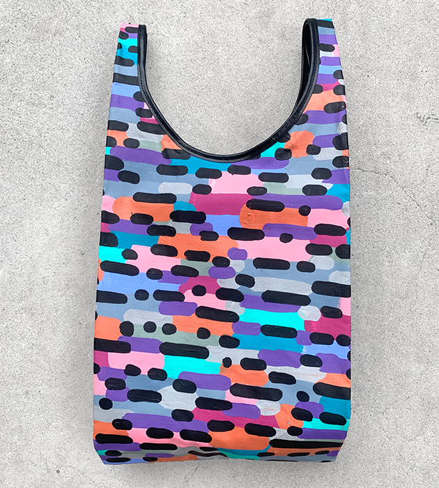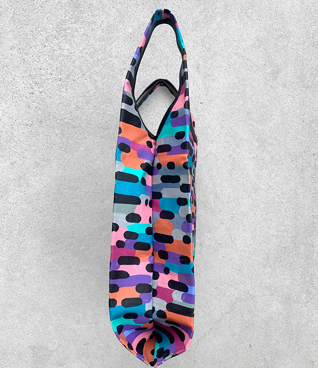 カラフルな模様を描いたキャンバス作品を解体して、職人による丁寧な縫製でシンプルで頑丈な極上の仕上がりとなっております。